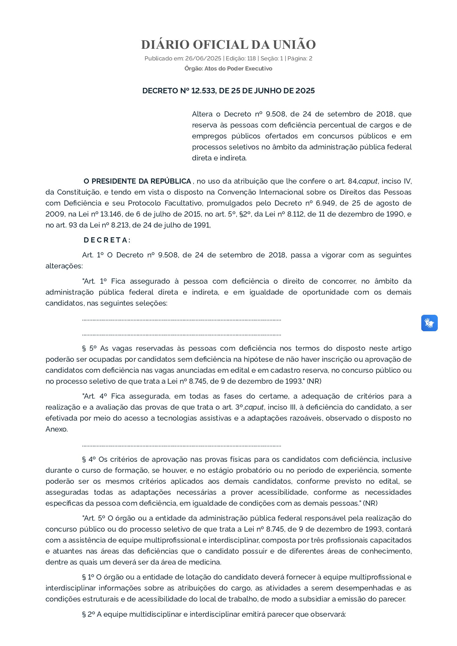 BRASIL. Decreto nº 12.533, de 25 de junho de 2025. Altera o Decreto nº 9.508, de 24 de setembro de 2018, que reserva às pessoas com deficiência percentual de cargos e de empregos públicos ofertados em concursos públicos e em processos seletivos no âmbito da administração pública federal direta e indireta. Diário Oficial da União: seção 1, Brasília, DF, n. 118, p. 2, 26 jun. 2025.