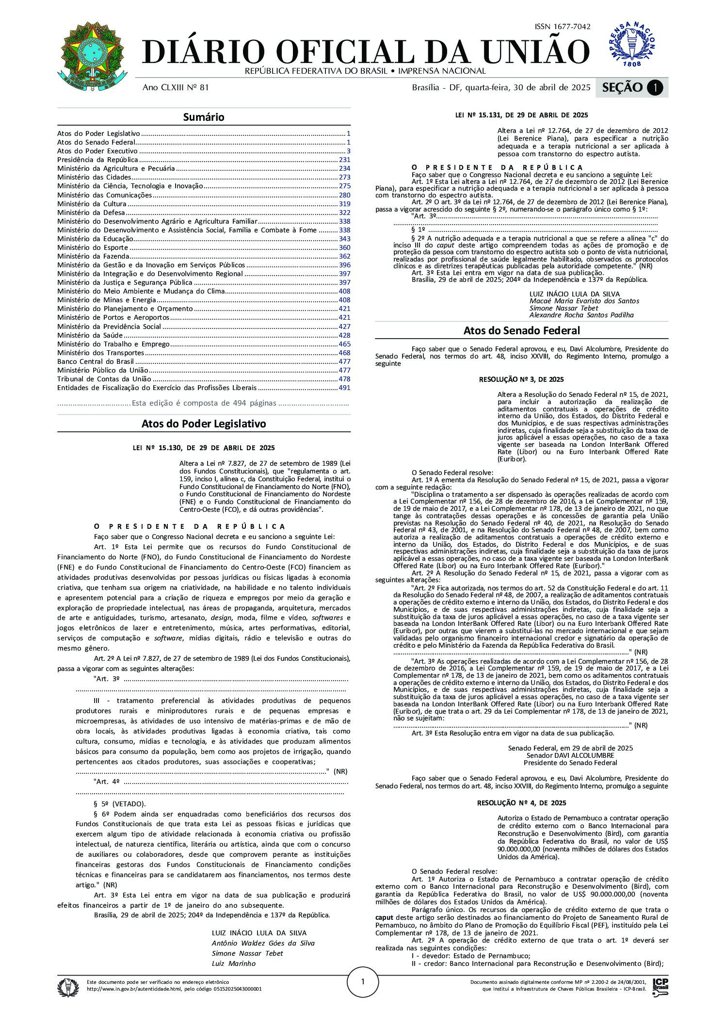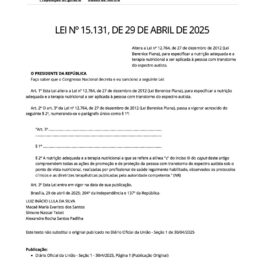BRASIL. Lei nº 15.131, de 29 de abril de 2025. Altera a Lei nº 12.764, de 27 de dezembro de 2012 (Lei Berenice Piana), para especificar a nutrição adequada e a terapia nutricional a ser aplicada à pessoa com transtorno do espectro autista. Diário Oficial da União: seção 1, a. 163, n. 81, Brasília, DF, p. 1, 30 abr. 2025.