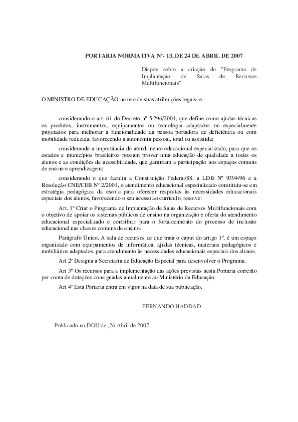 BRASIL. Ministério da Educação. Portaria nº 243, de 15 de Abril de 2016. Estabelece os critérios para o funcionamento,a avaliação e a supervisão de instituições públicas e privadas que prestam atendimento educacional a alunos com deficiência, transtornos globais do desenvolvimento e altas habilidades/superdotação. Diário Oficial da União: sessão 1, n. 73, Brasília, DF, p. 29, 18 de abril de 2016.