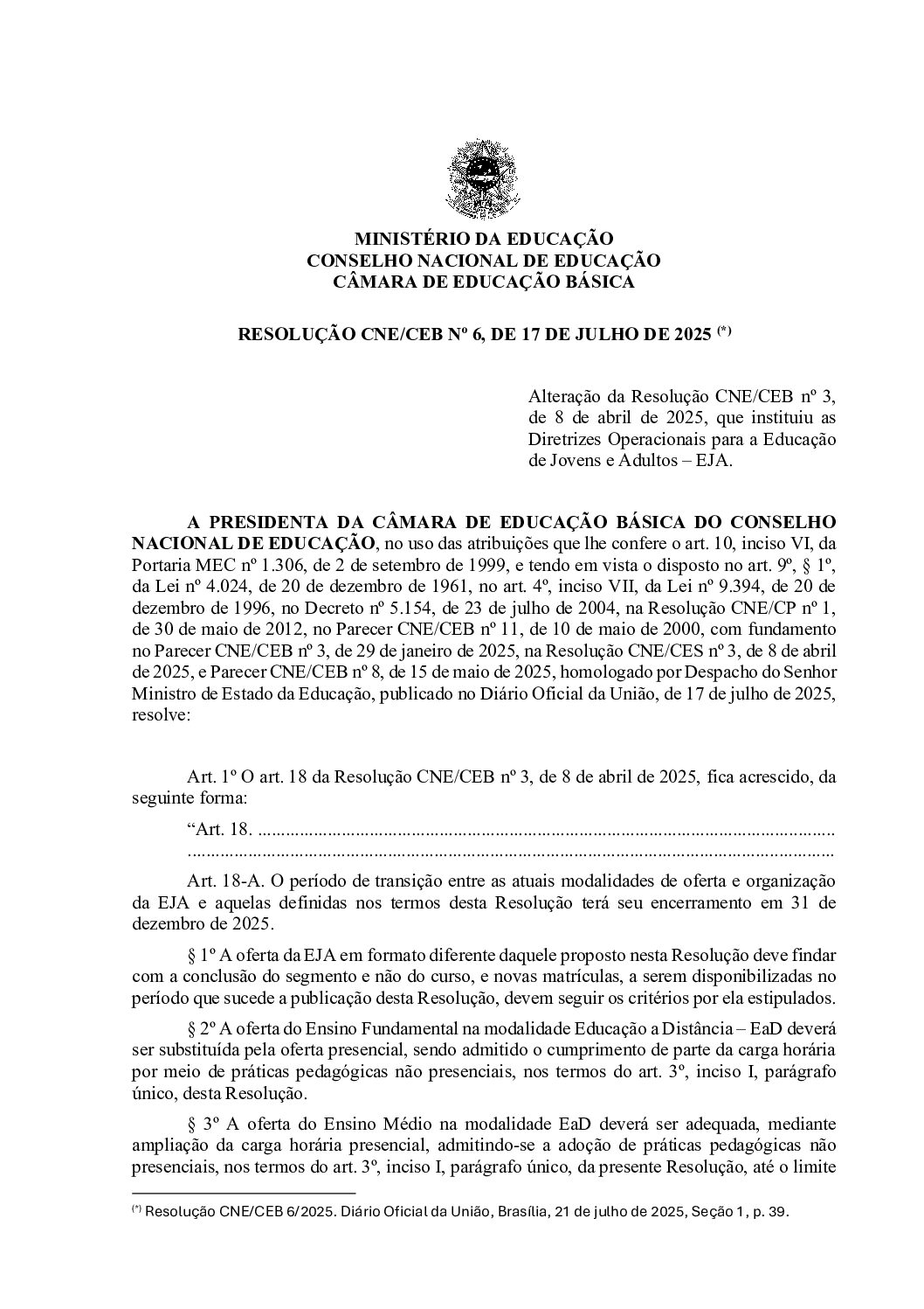 CONSELHO NACIONAL DE EDUCAÇÃO (Brasil). Resolução CNE/CEB nº 6, de 17 de julho de 2025. Alteração da Resolução CNE/CEB nº 3, de 8 de abril de 2025, que instituiu as Diretrizes Operacionais para a Educação de Jovens e Adultos – EJA. Diário Oficial da União, Sessão 1, a. 163, Brasília, n. 145, p. 39, 4 ago. 2025.