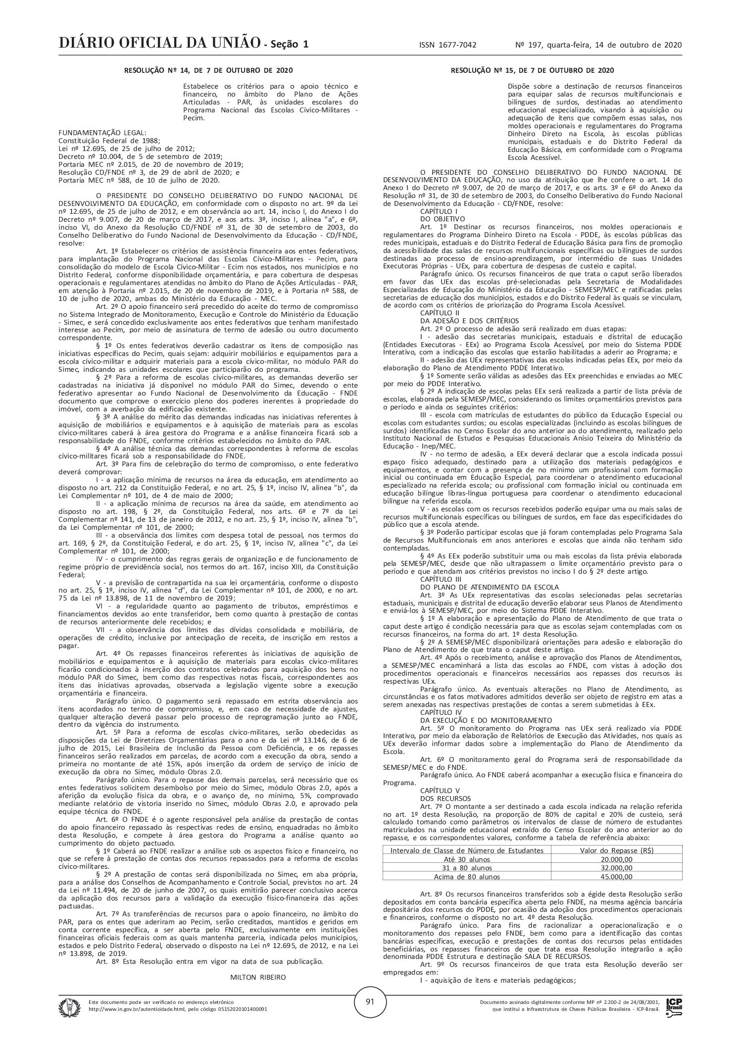 FUNDO NACIONAL DE DESENVOLVIMENTO DA EDUCAÇÃO (Brasil). Resolução n. 15, de 7 de outubro de 2020. Dispõe sobre a destinação de recursos financeiros para equipar salas de recursos multifuncionais e bilíngues de surdos, destinadas ao atendimento educacional especializado, visando à aquisição ou adequação de itens que compõem essas salas, nos moldes operacionais e regulamentares do Programa Dinheiro Direto na Escola, às escolas públicas municipais, estaduais e do Distrito Federal da Educação Básica, em conformidade com o Programa Escola Acessível. Diário Oficial da União: sessão 1, n. 197, Brasília, DF, p. 91, 14 de outubro de 2020.
