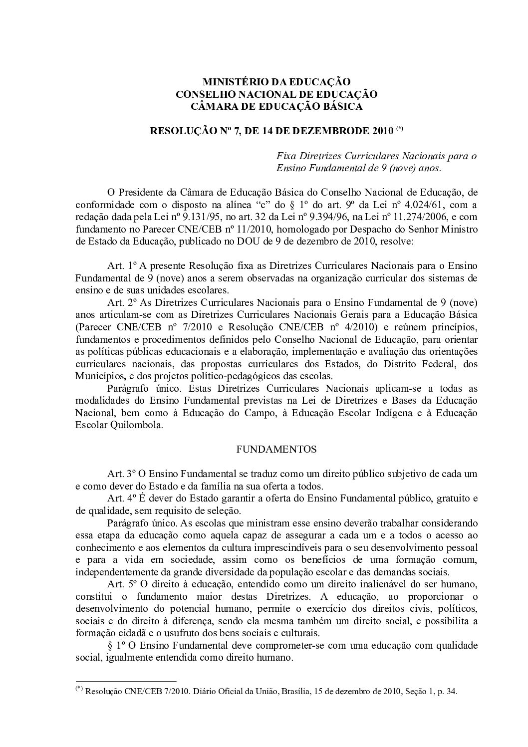 Documentos 2010_BRASIL_DOU_Resolucao_7 Baixar 2010_BRASIL_CNE_CEB_Resolucao_7 Baixar 2010_BRASIL_DOU_Resolucao_7 2010_BRASIL_CNE_CEB_Resolucao_7 MetadadosTítuloResolução nº 7, de 14 de dezembro de 2010.Instância responsávelMinistério da Educação (MEC) > Conselho Nacional de Educação (CNE) > Câmara de Educação Básica (CEB)Origem do DocumentoDocumento NacionalAno2010CaputFixa Diretrizes Curriculares Nacionais para o Ensino Fundamental de 9 (nove) anos.Palavras-chaveDiretrizes Curriculares Nacionais | Educação BásicaKeywordEducational Planning | Elementary EducationTipologia legislativaResoluçãoReferênciasCONSELHO NACIONAL DE EDUCAÇÃO (Brasil). Resolução nº 7, de 14 de dezembro de 2010. Fixa Diretrizes Curriculares Nacionais para o Ensino Fundamental de 9 (nove) anos. Diário Oficial da União: seção 1, n° 239, Brasília, DF, p. 34, de 14 dez. 2010. Item anteriorPortaria normativa nº 13, de 24 de abril de 2007. Próximo itemDecreto n. 12.385 de 18 de fevereiro de 2025.